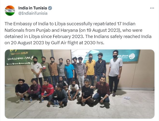 On the evening of August 20th, 17 Indian nationals were rescued from captivity in Libya. These individuals had been held captive in the city of Zwara in the North African country of Libya. They had been lured to Libya by false promises of employment in Italy, having been illegally trafficked by deceitful intermediaries. Also Read: Individual Attacked with Sword and Shot Amidst Outbreak of Violence at UK Kabaddi Match Let's delve into the details of this incident: Seventeen Indian men hailing from the northern states of Haryana and Punjab were sent to Libya by middlemen and agents responsible for this fraudulent scheme. Initially, these men were taken to Dubai and then subsequently to Egypt, from where they were sold to the mafia in Libya. In Libya, they were subjected to unpaid labor, as well as physical torture and abuse at the hands of their captors. Sources indicate that a significant sum of money was extorted from them, based on hopes of achieving grand aspirations. An approximate amount of 14-16 lakhs rupees was taken from these men. They have provided information regarding their agents and middlemen. Within a few days of their arrival in Libya, these men managed to contact their families. The families of these nationals informed the Indian embassy in Tunis, which oversees matters related to Libya. The embassy maintained continuous communication with the families of the captives. Throughout the months of May and June, the embassy persistently engaged with Libyan authorities in an effort to resolve the situation. [caption id="attachment_9103" align="alignnone" width="660"]