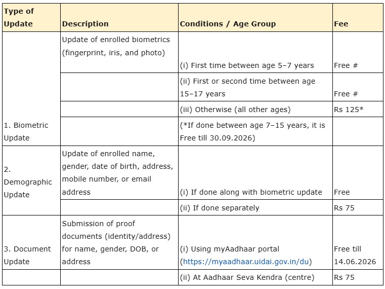 Under the new rules, anyone with an active mobile number linked to their Aadhaar can initiate updates like name, address, date of birth, or mobile number online. However, biometric updates — such as fingerprints, iris scans, or photographs — will still need an in-person visit to an Aadhaar Seva Kendra. The system will rely on document uploads and automated verification to reduce manual errors and processing delays.Revised Fee Structure