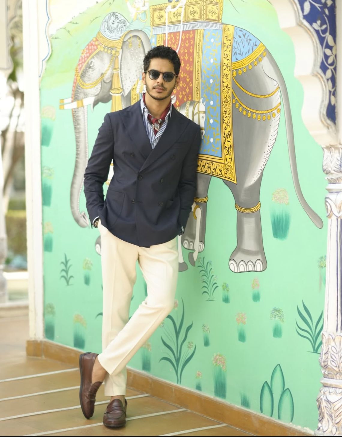 Known for creating fashion statements with his dynamic styling sense, Ishaan Khatter opted for a subtle palette. He sported straight-fit cream pants, paired it with a white & blue striped shirt, and layered it with a double-breasted navy blue coat. Lastly, the ‘Dhadak’ actor completed his look with sleek sunglasses and a pair of brown loafers.
