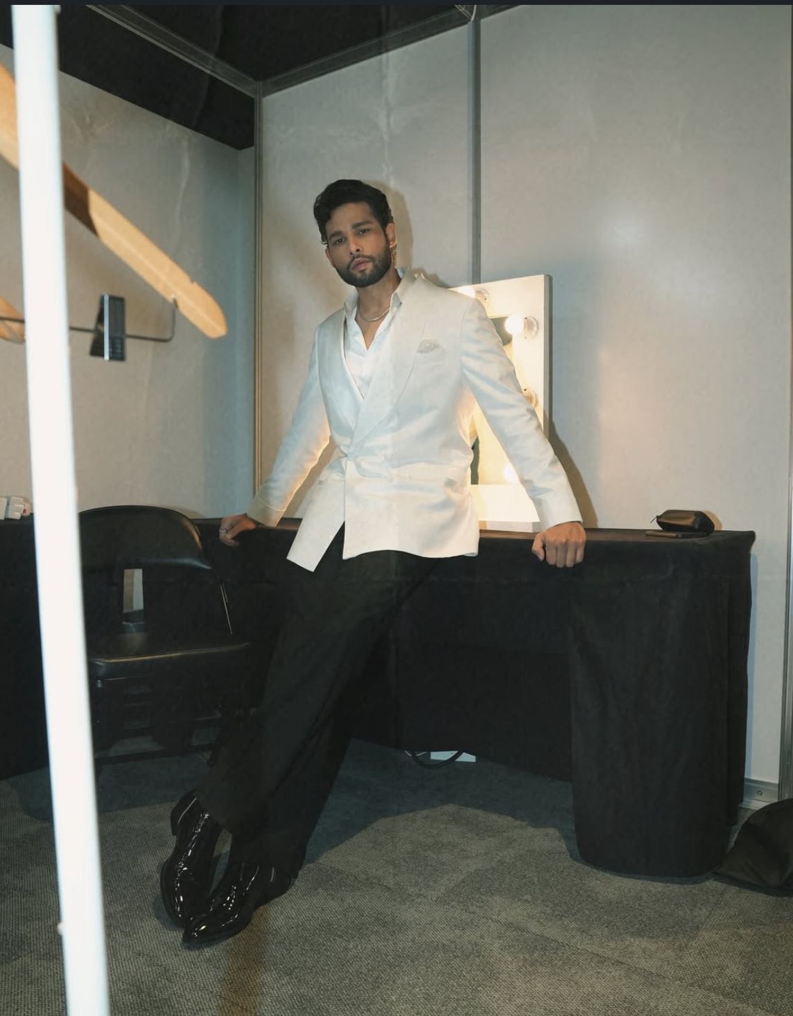 Siddhant Chaturvedi shows how to stand apart in a signature white and black suit. The ‘Gully Boy’ actor looked as striking as ever in black pants, paired with a classic white shirt, and topped it off with a sleek white coat. Staying devoid of any accessories or drama, Siddhant simply completed his look with glossy shoes.