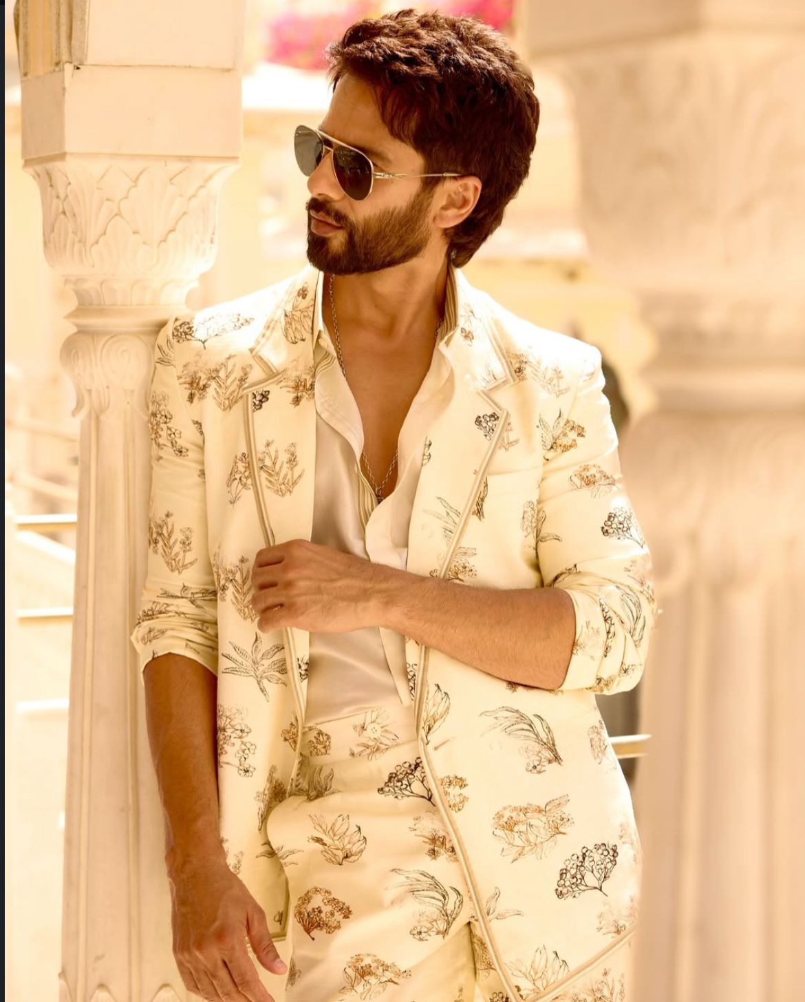 Known for effortless charm and charisma, Shahid Kapoor opted for an off-white palette for his suit. The actor stunned in a creation by Anita Dongre by sporting a printed suit, featuring intricate borders and flora prints overall. He opted for a contemporary look by pulling up his sleeves to his elbows, and simply adding a touch of suave with metal sunglasses.