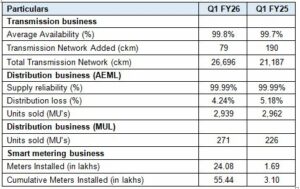 • The distribution business recorded a steady business performance. AEML’s Regulated Asset Base (RAB)stands at Rs 9,433crores (Equity of Rs 5,024 crores and Debt of Rs 4,409 crores)as of Q1FY26, recording a growth of 13% YoY