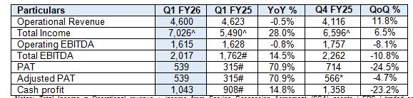 Q1FY26 PAT of Rs 539 crore increased by 71% YoY due to double-digit growth in total EBITDA and aided by lower depreciation of Rs 33 crore YoY and net tax outgo which was down by Rs 19 crore YoY