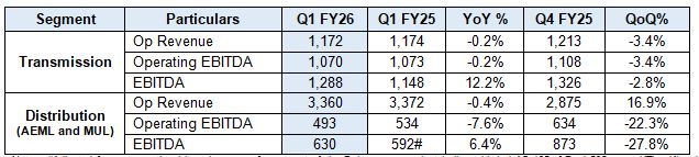 • During Q1FY26, the total income of Rs 7,026 crore grew by 28% due to stable operating performance, higher SCA,EPC, and treasury income • The operational revenue of Rs4,600 croreended flat YoY with modest contribution from the new transmission assetsdue to recent commissioning (MP–II in Q3FY25 and Khavda Ph-II-A, KPS – 1 and Sangod in the later part of Q1FY26)which was largely offset by the normal decline in the revenue of cost-plus transmission assets • The contribution from the newly commissioned transmission assets should meaningfully improve from the next quarter onwards. The revenue in the Distribution segmentwas soft due to the earlyarrival of monsoonresulting in flat volume growth in the Mumbai distribution area