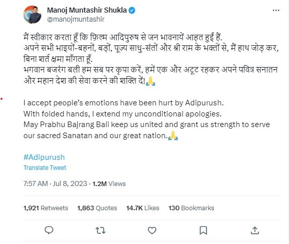 emotions,” tweeted Manoj Muntashir. My sincerest apologies. May Prabhu