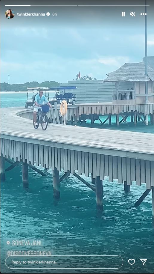 Actor Akshay Kumar is currently savoring his family vacation in the picturesque Maldives. Adding a delightful touch to the holiday, Akshay's wife and accomplished author, Twinkle Khanna, treated fans to a heartwarming Instagram Story on Monday. The video captures Akshay joyfully cycling alongside his daughter Nitara, showcasing the actor's cherished moments of father-daughter bonding. Also Read: Deepika Padukone treats fans to a mesmerizing sunrise view