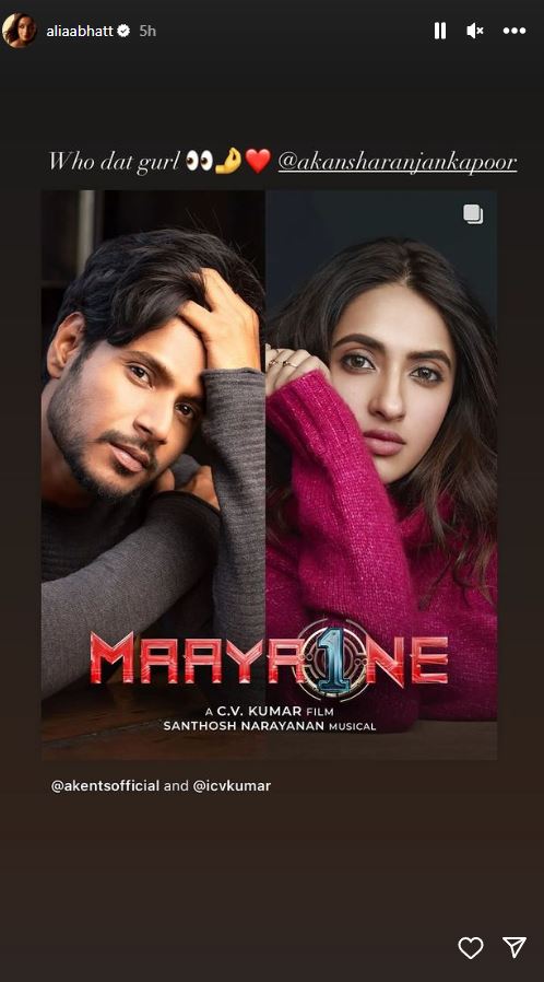 Alia Bhatt extends a heartfelt shoutout to her best friend and fellow actor, Akansha Ranjan Kapoor, who is gearing up for her debut in Telugu cinema with CV Kumar's much-anticipated directorial venture, 'MaayaOne,' starring opposite Sundeep Kishan. Also Read: Tanushree speaks out after 18 years on Intimate Scene with Emraan Hashmi Taking to her Instagram story, Alia shared the film's poster featuring Akansha, captioning it with, "Who dat gurl @akansharanjankapoor."