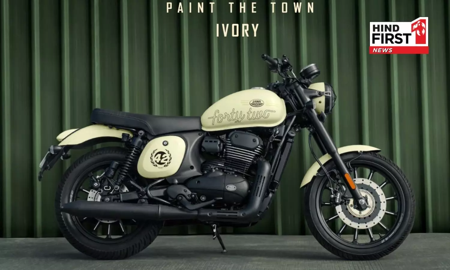 The pastel ivory shade is applied to the bike's front fender, headlamp cover, fuel tank, side panels, and rear fender. The tank is embossed in large and bold letters with the number 'Forty Two', while the side panels feature the number '42'. These details set it apart from other color variants. The engine and other parts are finished in black paint, giving the bike a factory custom look.