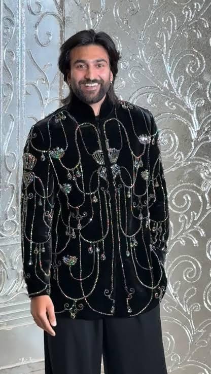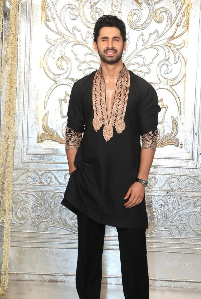 The actor sprinkled charm in a full-black kurta suit, featuring a patterned and embellished kurta, paired with free-flowing pants. He completed his look with glossy black shoes.