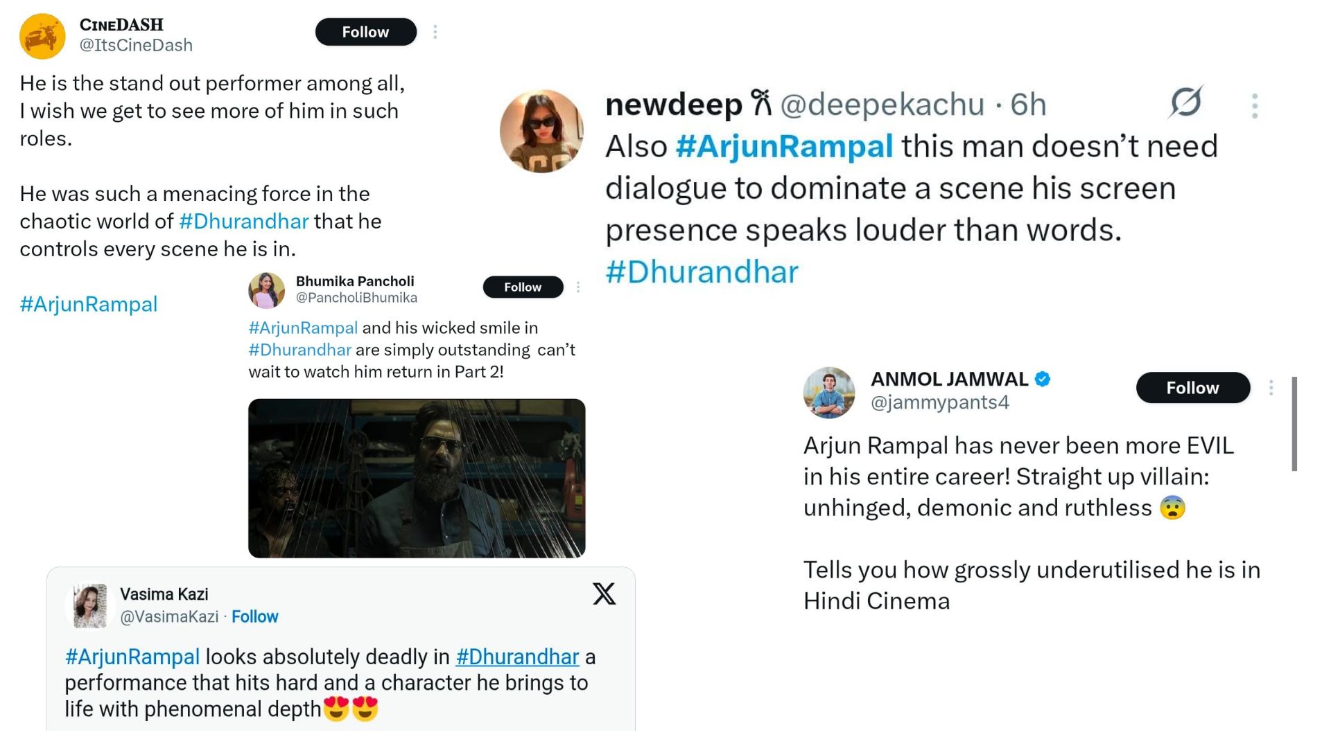 A user hailed his strong screen presence and wrote, “He is the standout performer among all, I wish we coud get to see more of him in such roles. He was such a menacing force in the chaotic world of #Dhurandhar that he controls every scene he is in,” and another wrote, “#ArjunRampal looks absolutely deadly in #Dhurandhar! A performance that hits hard and a character he brings to life with phenomenal depth.” A user simply described his act as a “powerhouse performance."