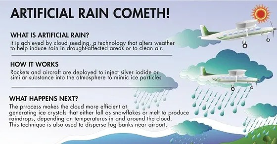 This also attracts moisture which thickens and takes the form of water droplets and rains down. The attempt is to change the order of the natural development of the cloud, so that it can rain artificially. Artificial rain is a weather modification technique