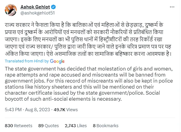 Ashok Gehlot's Bold Step: No Government Jobs for Perpetrators of Women's Crimes