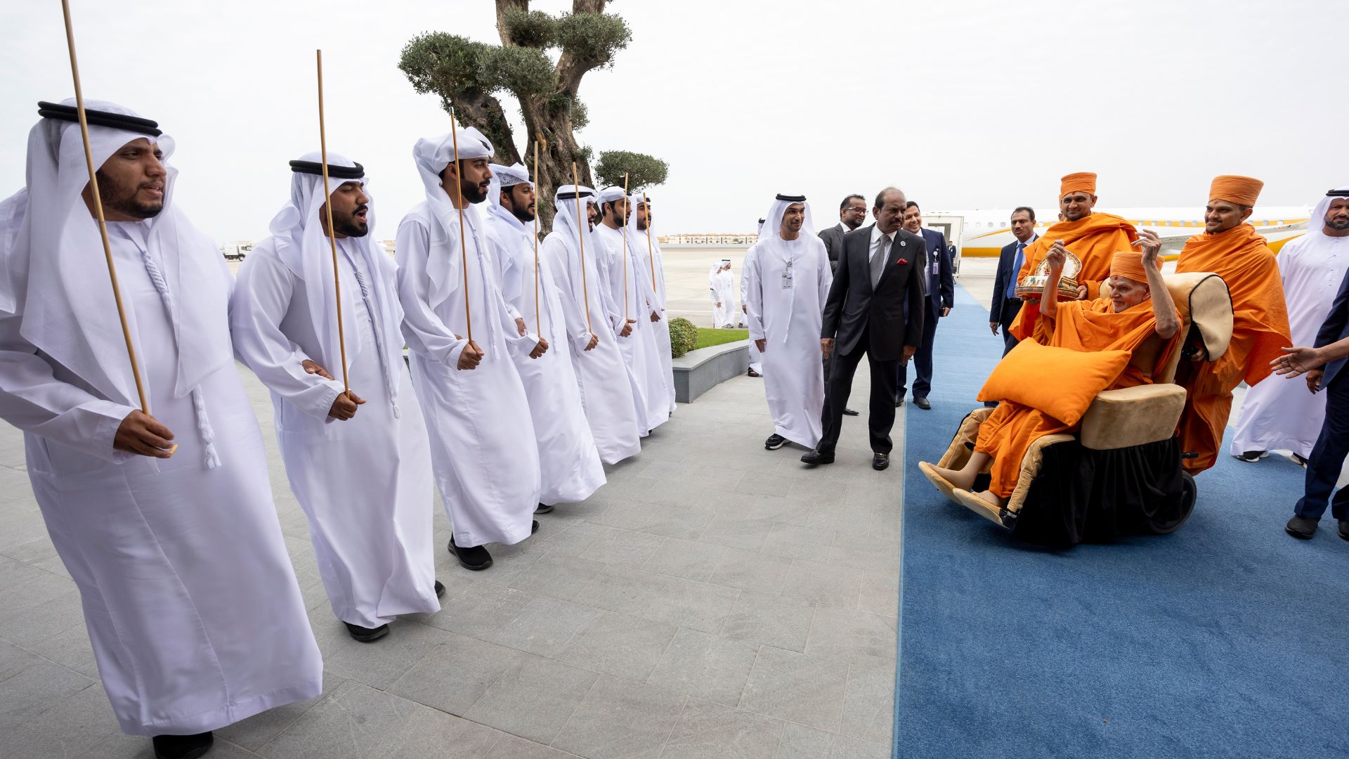 Pujya Mahant Swami Maharaj told them, “Your love and respect is touching. The leaders of the UAE are great and big-hearted.” His Holiness Mahant Swami Maharaj as the 'State Guest' was warmly welcomed by dancers, drummers and singers in the traditional Arabic cultural style of 'Al-Ayyala'. This type of presentation is usually reserved for national festivals or to welcome heads of state.