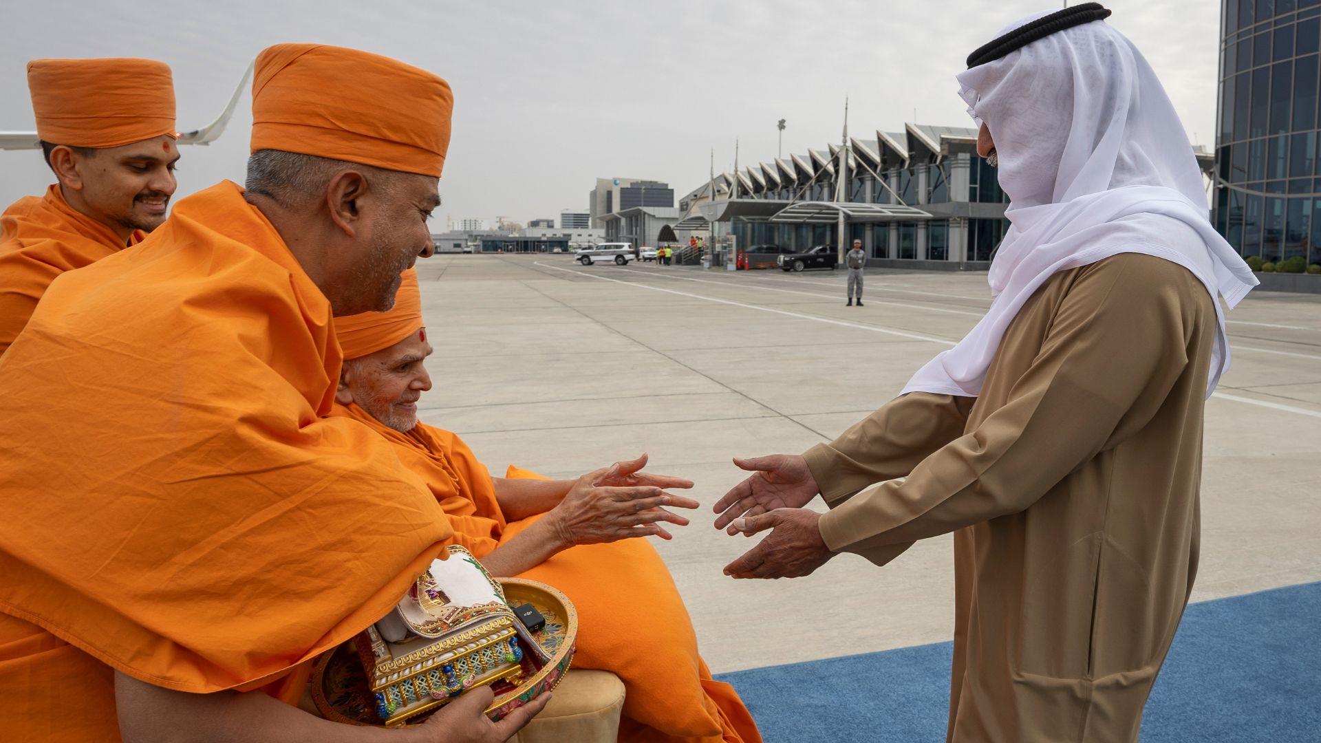 On arrival at the airport, His Holiness Mahant Swami Maharaj was warmly welcomed by His Highness Sheikh Nahyan Mubarak Al Nahyan, UAE Minister of Tolerance. Sheikh Nahyan welcomed Pujya Mahant Swami Maharaj and said, “Welcome to the UAE. This country is blessed by your presence. We are touched by your good wishes. We feel your blessings.”