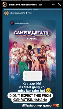 Campus Beats: Amazon’s free video streaming service has successfully entertained audiences with its vast, path-breaking content library. The streaming service recently released two seasons of its much loved and anticipated teen drama, Campus Beats, featuring Shantanu Maheshwari and Shruti Sinha in lead roles, along with Sahaj Singh Chahal, Tanvi Gadkari, Harsh Dingwanii, Tanya Bhushan, Dhanshree Yadav, Teriya Magar, Adnan Khan, and Rohan Pal in pivotal roles. Also Read: From Blog to Bollywood: MissMalini marks 15 Years of Redefining Entertainment Earlier today, it was observed that Shantanu Maheshwari and Shruti Sinha unfollowed each other on Instagram accounts. Not just that, after the spat, cryptic stories on their handles have sent fans into a speculative frenzy. Raising their curiosity meter, fans were intrigued to know what would happen next as the final season of Campus Beats is just around the corner. Fans have admired their chemistry ever since they lit up the screens from the first season of Campus Beats, and now this incident is making everyone wonder what is in store next!