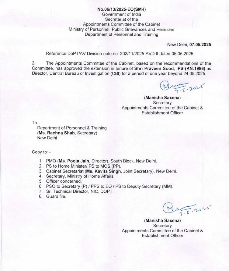 The Cabinet Appointment Committee has also issued an order regarding this. Earlier, a meeting of the Cabinet Appointment Committee was held under the leadership of PM Modi in which Rahul Gandhi and CJI participated. Praveen Sood Extension Letter