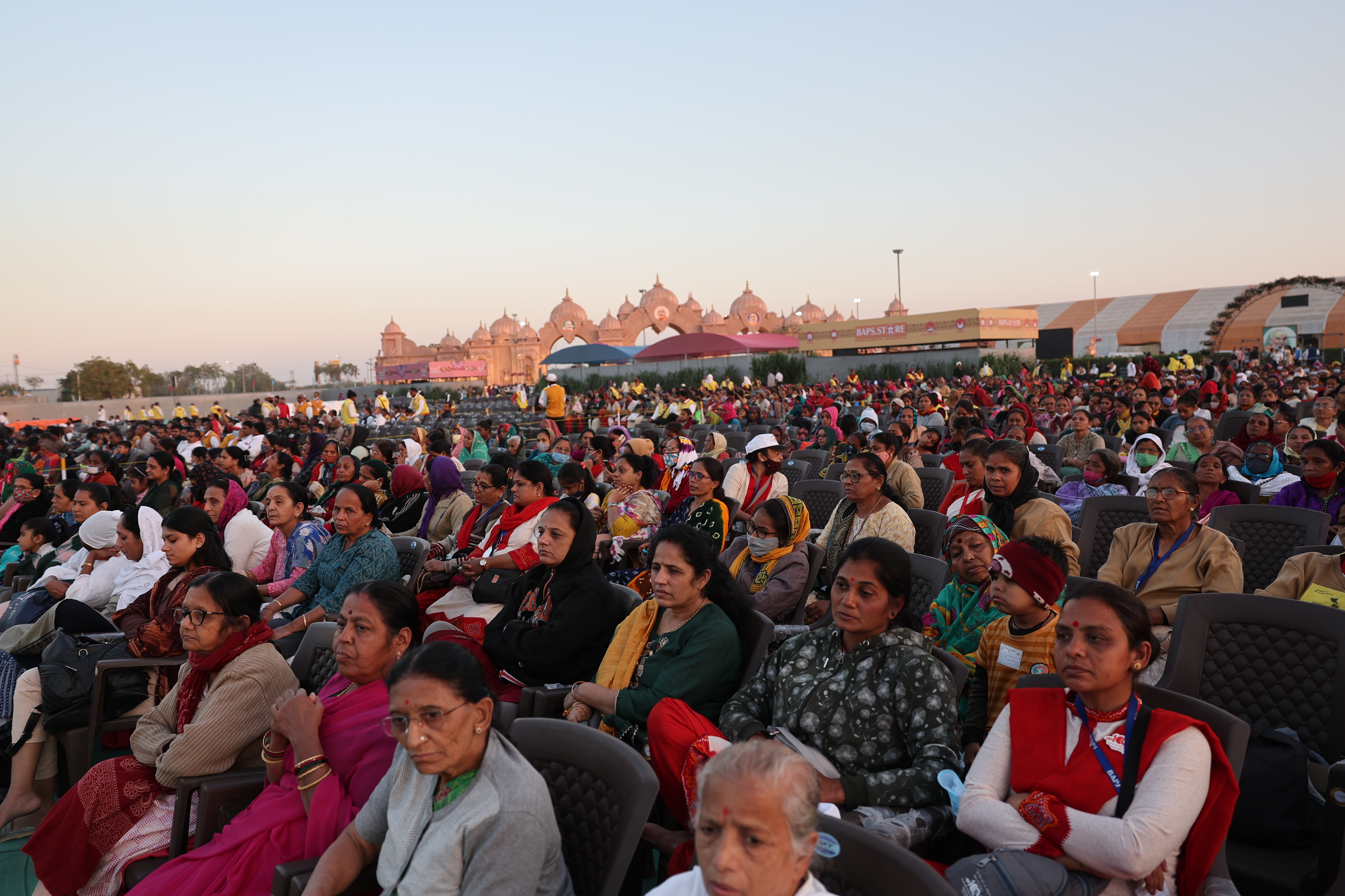 His Holiness Mahant Swami Maharaj and several dignitaries paid homage to Pramukh Swami Maharaj’s selfless service to millions around the world as tens of thousands gathered to commemorate ‘Seva Day: Celebrating Selfless Service’ at Pramukh Swami Maharaj Nagar on 28 December 2022.Also read: Day 3 : Pramukh Swami Maharaj Nagar.Evening assembly : In an assembly of tens of thousands at Pramukh Swami Maharaj Nagar on 28 December, several leaders and dignitaries joined His Holiness Mahant Swami Maharaj to pay tribute to Pramukh Swami Maharaj’s tireless and selfless services to society around the world. Pramukh Swami personified his own universal teaching, ‘In the joy of others lies our own.’Adarshjivandas Swami, the biographer of Pramukh Swami Maharaj, narratedepisodes from the life of Pramukh Swami Maharaj in his series ‘Pramukh Charitam’. He explained, “The replica of New Delhi’s Akshardham at the heart of the Festival grounds is one of the most well-known Hindu templ