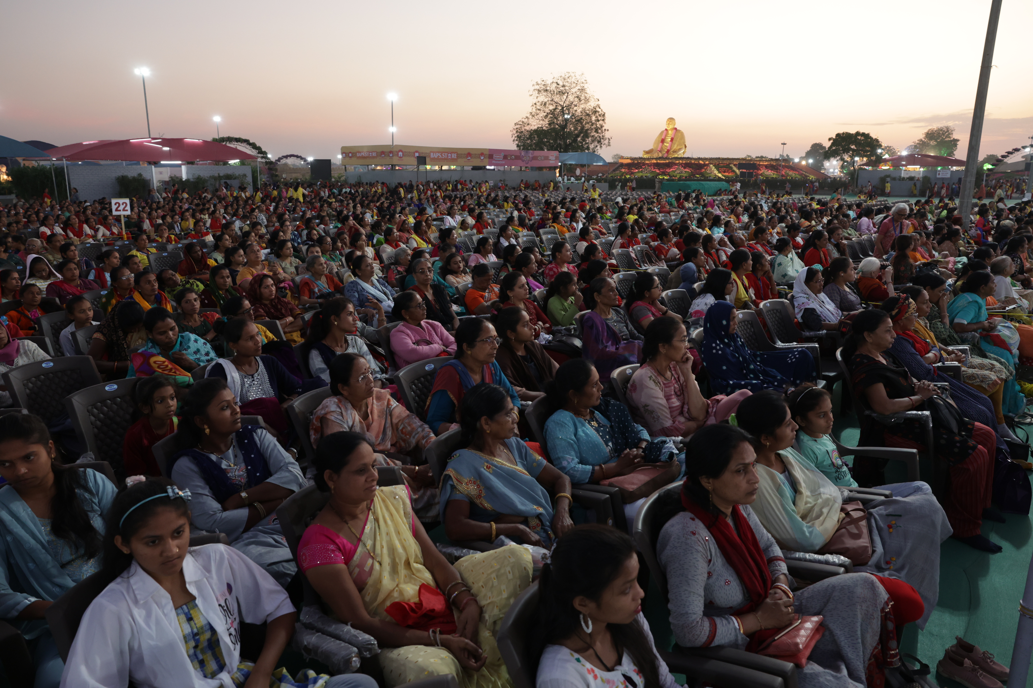 The programm started at 5:15 pm with Devotional songs paying homage to Pramukh Swami Maharaj’s devotion to the guru. Then the programm was started when BAPS scholar Adarshjivandas Swami narrated incidents in Pramukh Swami Maharaj’s life explaining how people experienced him to be an ideal guru. While narrating he said, “Every corner of this festival reflects Pramukh Swami's divine life. When we observe Pramukh Swami Maharaj’s 30-foot sculpted image we gain a glimpse of his simple life filled with the purity of God. Many people of varied ages, races, and religions were inspired to transform their lives just by looking at a simple photo of Pramukh Swami Maharaj. Such divinity and peace flowed from just his photo that they stated they would never tire of looking at him. So, it is no surprise that upon people’s first interaction with Pramukh Swami Maharaj they would be overwhelmed with feelings of love, divine peace, and purity. People were attracted to Pramukh Swami Maharaj's ears, his voice, his smile, his laugh, his walk, and every aspect of his life. This attraction to Pramukh Swami Maharaj was the attraction of God; the peace experienced was the peace of God; because Pramukh Swami Maharaj was one with God.”