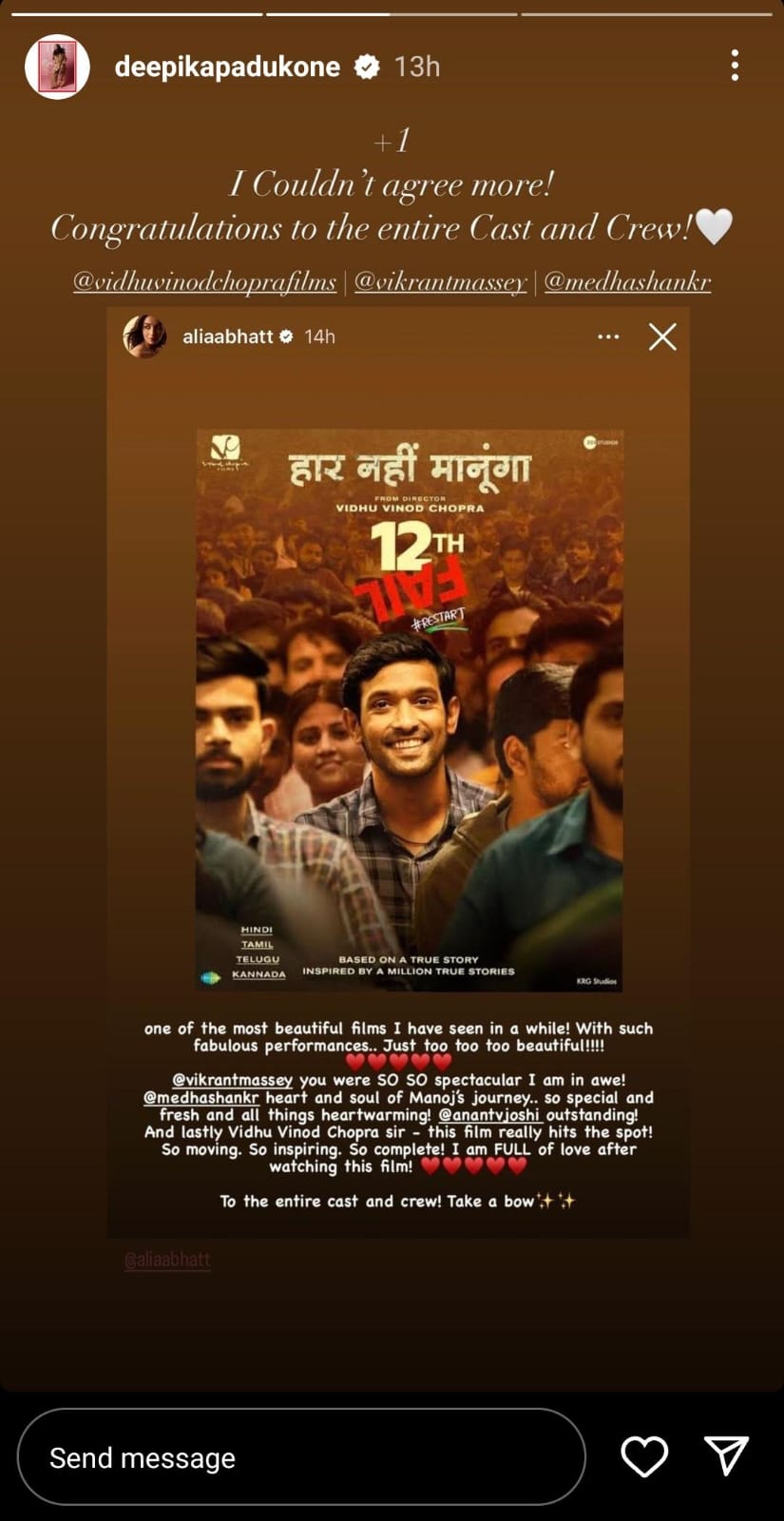 On Tuesday night, Deepika Padukone shared her thoughts on '12th Fail' after actor Alia Bhatt posted a glowing review on her Instagram story. Reposting Alia's review, Deepika wrote, "I couldn't agree more! Congratulations to the entire cast and crew." Recently, Alia had lauded Vikrant Massey's performance in the biographical drama. She took to her Instagram story to share the poster of '12th Fail' along with a note. "One of the most beautiful films I have seen in a while! With such fabulous performances.. Just too too too beautiful!!!!@vikrantmassey you were SO SO spectacular I am in awe!@medhashankr heart and soul of Manoj's journey.. so special and fresh and all things heartwarming! Canantvjoshi outstanding!And lastly Vidhu Vinod Chopra sir - this film really hits the spot! So moving. So inspiring. So complete! I am FULL of love after watching this film! To the entire cast and crew! Take a bow," she posted.