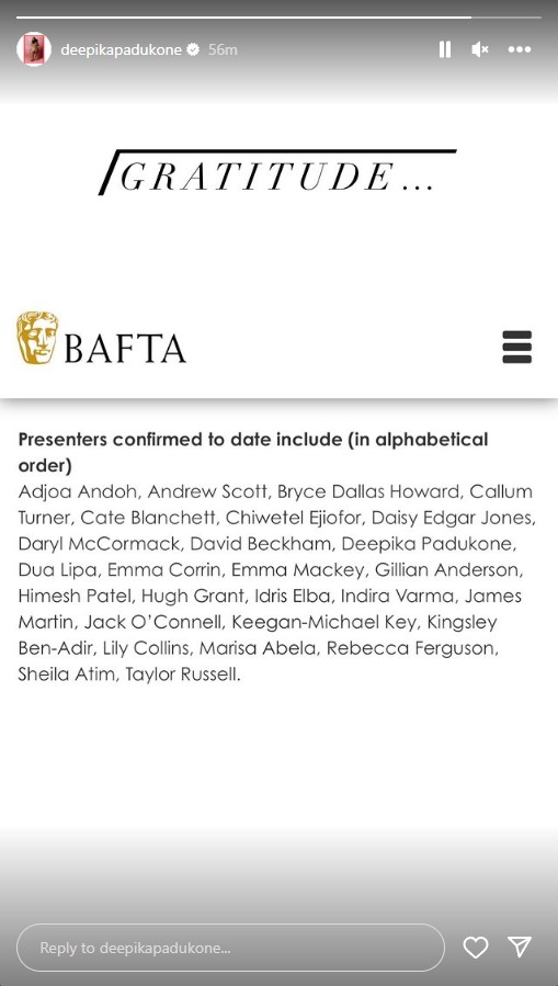 Indian actor and producer, Deepika Padukone, 38, is all set to grace the upcoming BAFTA Film Awards as a presenter. The British Academy of Film and Television Arts (BAFTA) released the list of confirmed presenters, including Padukone, on Tuesday. Also Read: Bhool Bhulaiyaa 3: Kartik Aaryan welcomes Vidya Balan, ‘The OG Manjulika’ Expressing her gratitude, she shared the news on her Instagram Story. "Gratitude," she captioned the post.