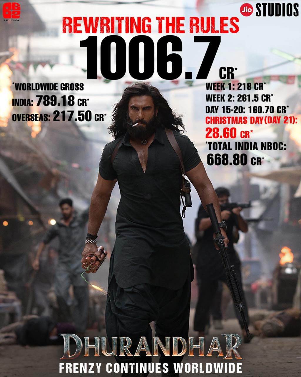 Dhurandhar Box Office: Dhurandhar delivered a blockbuster Christmas Day performance with Rs. 28.60 crore nett (India) on Day 21 (Thursday), taking its India nett total to Rs. 668.80 crore, while also surpassing the monumental Rs. 1000 crore mark at the worldwide box office within just three weeks of release. Also Read: This Is Why Arjun Rampal Wanted to Exit His Darkest Role in Aditya Dhar’s Dhurandhar The global milestone has been powered by a commanding domestic run and an exceptional overseas showing. With this extraordinary Christmas performance globally, Dhurandhar wraps Week 3 on a triumphant note, shattering long-held industry benchmarks.