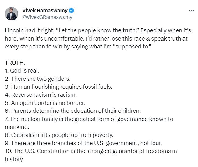 Vivek Ganapathy Ramaswamy is an American entrepreneur born to Indian immigrant parents who hail from the Indian state of Kerala. The Cincinnati-born pharmaceutical executive is running in the presidential race against his fellow Republican, Donald Trump. He has been gaining attention recently due to his strong and clear beliefs. According to him, the USA needs to change its foreign policies towards China, Ukraine, and Russia. He strongly believes in capitalism and advocates that the Biden administration has been withholding the truth from the citizens of America. He claims that if he were to become president, he would ensure that Americans know the truth they deserve to know. He believes that America is going through an adolescent-level identity crisis about who they truly are. If given the chance to be president, his role would be to guide America towards adulthood where its identity is strong and clear. Vivek Ramaswamy has been unapologetic about certain beliefs he holds as truth, such as the existence of God, the presence of only two genders, the value of capitalism, and the rights of parents to make decisions about their child's education. He has presented a list of 10 such points to Americans: