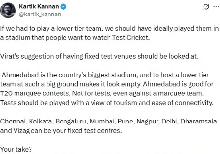 Former captain Virat Kohli has also previously expressed his views on this issue. In 2019, he said that India should have only five fixed Test venues so that visiting teams know where they will play, what kind of pitches and spectators they will receive. According to him, holding Tests at multiple venues is fine due to state associations' rotation policies and other reasons, but playing at stable and attractive venues would be more effective.