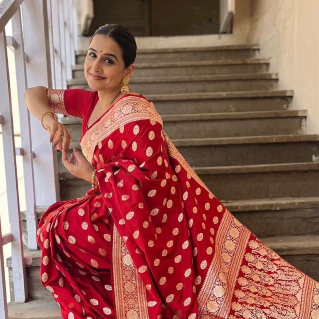 Vidya Balan’s love for this traditional attire is evident in her public appearances. She effortlessly combines traditional weaves with contemporary styles, making her saree look stand out. Draped in an exquisite red Banarasi saree adorned with intricate gold embroidery and complemented by elegant gold jhumkas, Balan exudes a captivating radiance. Vidya never fails to make heads turn with her saree ensembles.