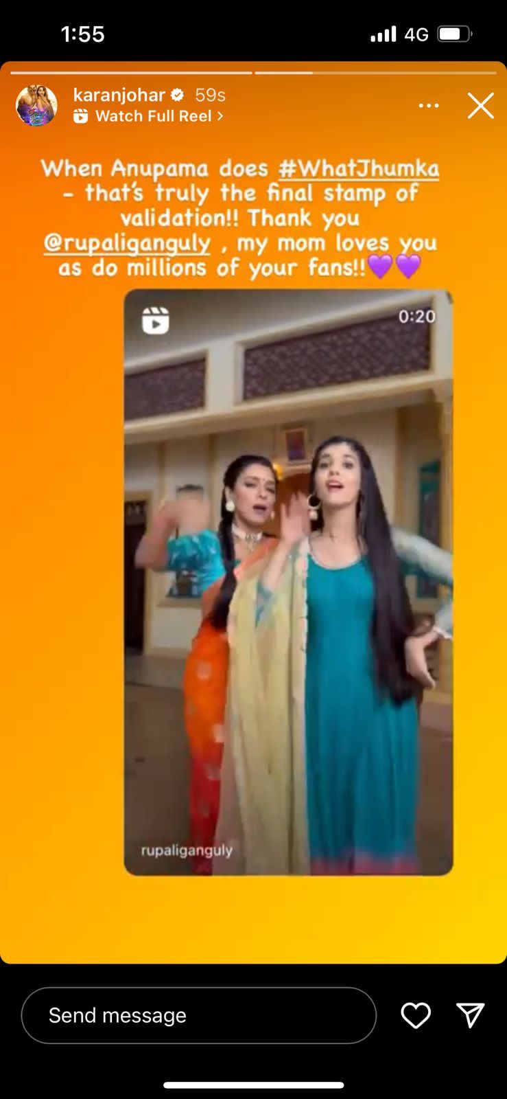 The former expressed his gratitude towards Rupali for recreating his song. Quickly sharing the video on his personal social media account, Karan Johar lauded Ganguly's dance reel, writing, "When Anupama does #WhatJhumka - that's truly the final stamp of Validation!! Thank you @rupaliganguly, my mom loves you as do millions of your fans!! "