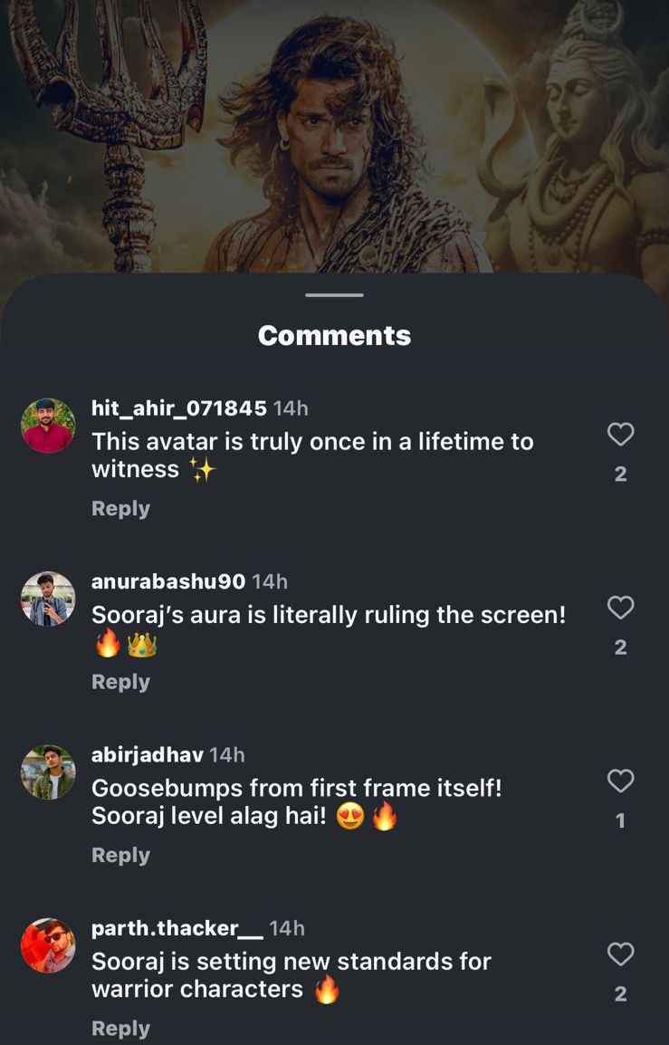 One user wrote, “This is gonna be an epic,” and another wrote, “Journey from HERO to LEGEND OF SOMNATH.” A comment read, “This poster shows your strength and journey, sir! Huge respect and love!” And another read, “Sooraj has set the bar too high for warrior characters.” A user wrote, “He’s serving looks and power together,” and another wrote, “He’s about to shake the entire industry with his warrior avatar.”View this post on Instagram