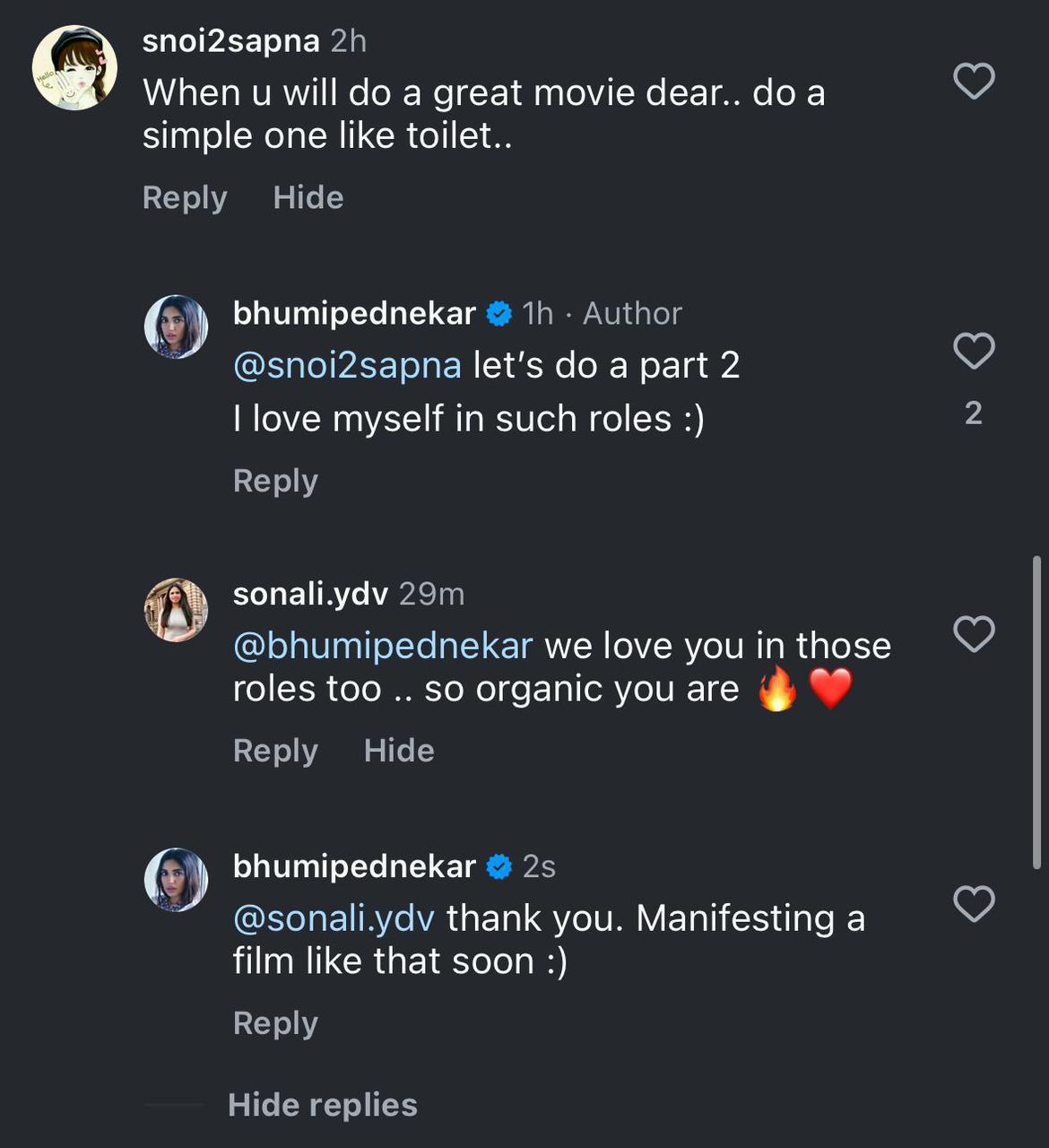 Mumbai: Bollywood actress Bhumi Pednekar has expressed her keen interest in reprising her role in a sequel to the critically acclaimed film "Toilet: Ek Prem Katha," starring Akshay Kumar, after fans commented about how they want to see her in more roles like this. Also Read: From Family Man To Raghu Thatha, Celebrating The Visionary Suman Kumar On His Birthday Responding to fan comments on social media, Bhumi showed her enthusiasm for returning to the character she played in the 2017 film. 1In response to one comment suggesting a sequel, Bhumi wrote, "Thank you. Manifesting a film like that soon :)"