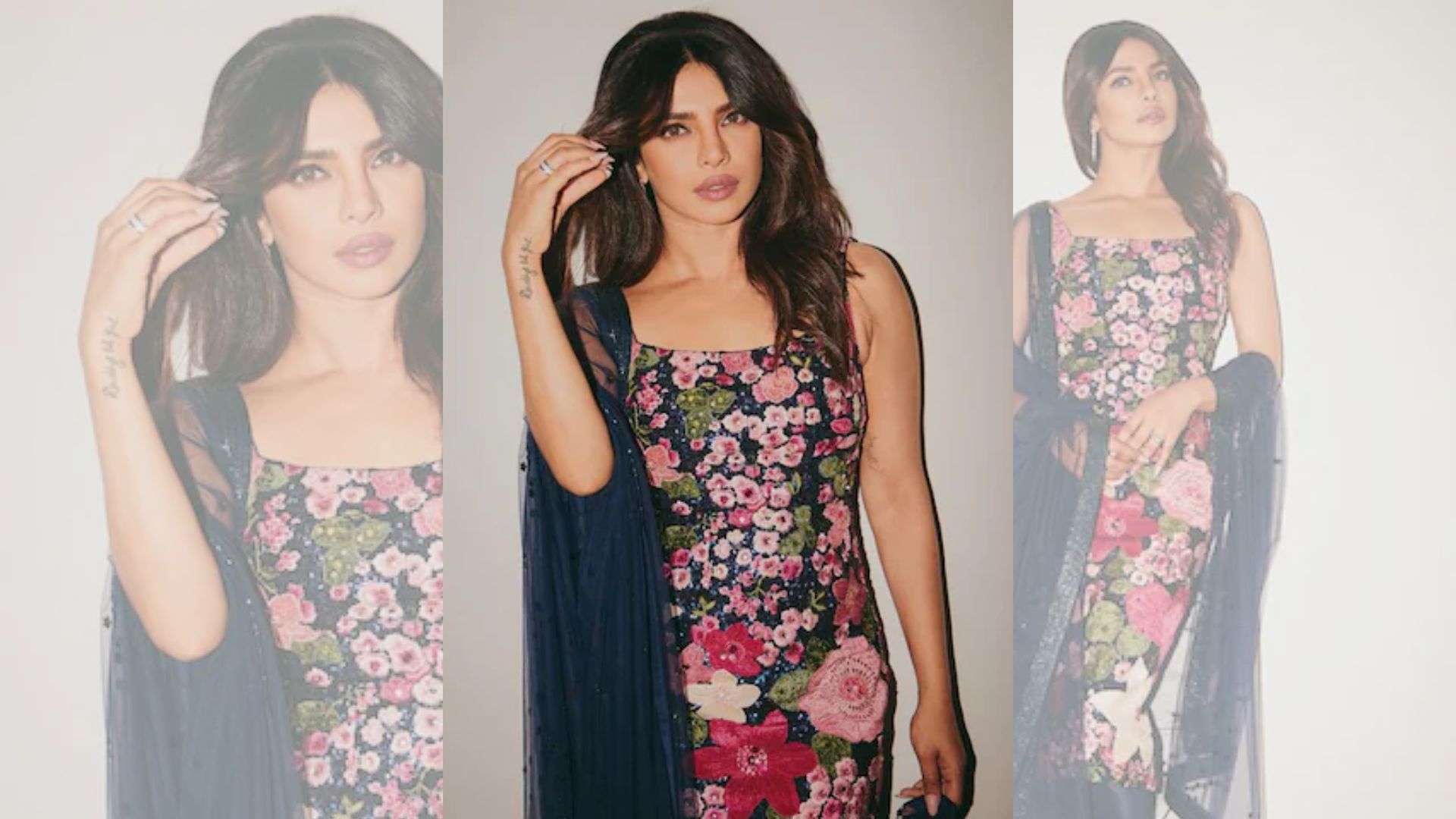 Priyanka Chopra, the quintessential 'Desi Girl', dazzled in a Sabyasachi suit set at the trailer launch of her Marathi film Paani. The rich blue ensemble featured colorful floral embroidery, a sleeveless kurta, matching churidar, and a sheer dupatta. Priyanka accessorized with silver dangler earrings and heels, while her soft pink lipstick, blushed cheeks, and kohl-accented lashes, along with straight hair, completed her refined look.