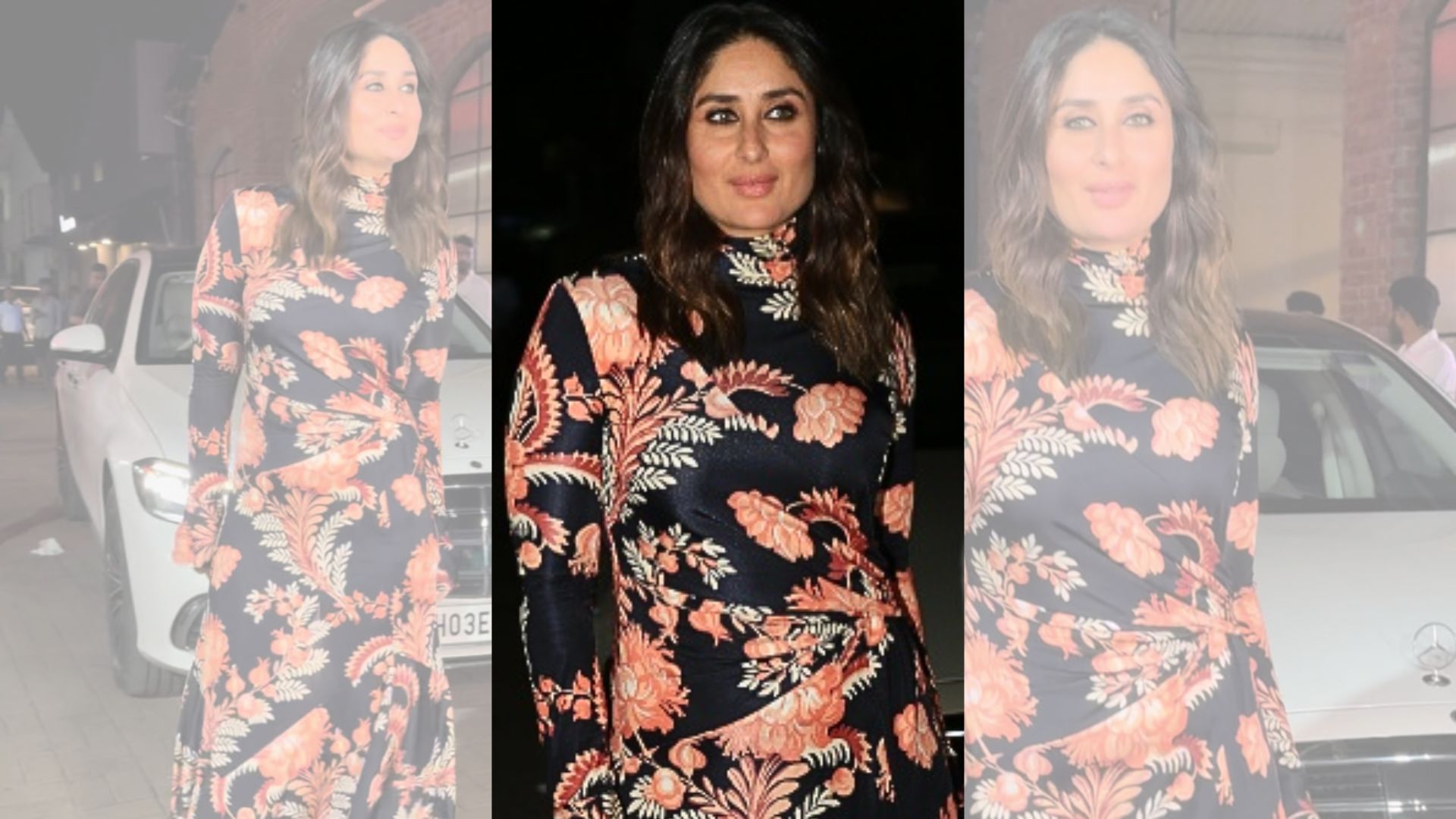 Kareena Kapoor stunned in an Etro floral dress at a recent event. The dress, with its closed neckline, full sleeves, and asymmetrical hemline, featured a black base with a large peach floral print. Metallic heels and loose waves in her hair added a touch of glamour to her already striking appearance. Her blushed cheeks and smokey eyes perfectly complemented the outfit, making her one of the week’s best-dressed.