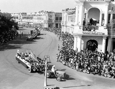 About the first Republic Day celebrations, the more than 100-year-old Fauji Akhbar had said, "The President At 2:30 p.m. sharp he left the Government House (now Rashtrapati Bhavan) with full state honours, in a 35-year-old carriage specially renovated for the occasion, bearing the new Ashoka capital and drawn by six sturdy Australian horses at a slow pace. As the procession passed the Irwin Amphitheatre, shouts of "Jai" filled the streets and people from trees, rooftops and every possible vantage point broke out in cheers.