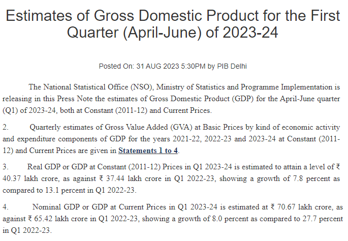 According to national statistical office of the Ministry of Statistics and Programme implementation, the Gross domestic Product(GDP) growth rate of India in the first quarter (Q1) fiscal year 2023 is 7.8per cent. These figures were released on Thursday by the government of India. it shows that India is growing at fastest pace in this financial year.