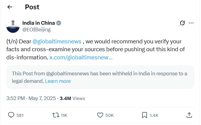 The Embassy also highlighted that many social media accounts supporting Pakistan were spreading fake claims about the Indian Army’s losses. These false stories were shared without proper fact-checking, which the Embassy called a “serious lapse in responsibility and journalistic ethics.”Global Times Account Now Withheld in India
