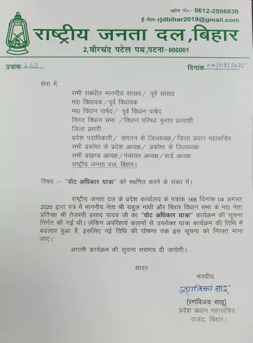 Congress leader Rahul Gandhi's Vote Adhikar Yatra starting from August 10 has been postponed for the time being. This information has been given by the Rashtriya Janata Dal. However, no reason has been revealed as to why this visit of Rahul has been postponed. Rahul Gandhi's Vote Adhikar Yatra was to start from Sasaram, in which Tejashwi Yadav was also going to participate. According to the information, now the schedule of the Yatra will be released afresh.