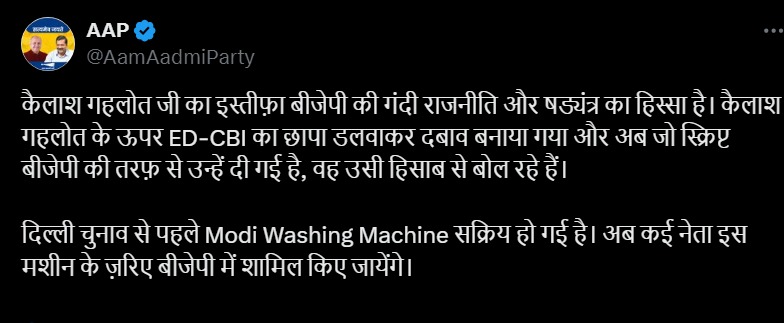 Reacting to this matter, senior party leader and Rajya Sabha member Sanjay Singh said that Kailash Gehlot's resignation is part of BJP's dirty politics and conspiracy. He said that Kailash Gehlot was pressurized by conducting ED-CBI raids and now he is speaking according to the script given to him by BJP. He said that Modi washing machine has become active before Delhi elections.
