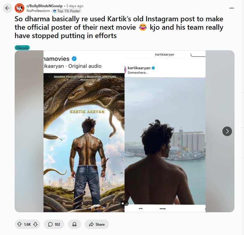 A Reddit user shared an old Instagram photo of Kartik Aaryan that looks very similar to the official Naagzilla poster. The user claimed that Dharma reused an old post instead of doing a new shoot. This made fans question the effort put into the movie’s promotion.Social Media Reactions Were Brutal