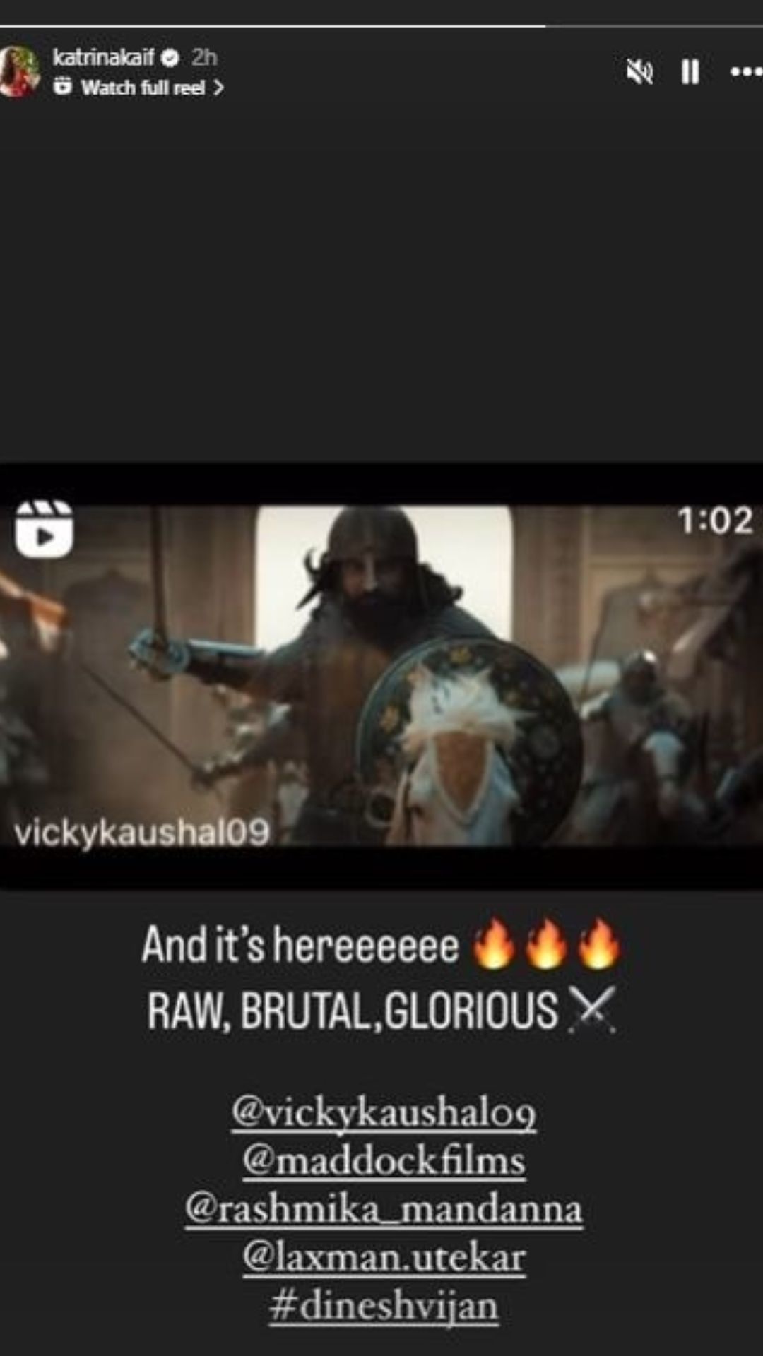 Katrina Kaif once again proves she's Vicky Kaushal's biggest fan. After the teaser release of Vicky’s upcoming film Chhava, Katrina took to her Instagram Stories to give a shout-out to her husband. The teaser offers a glimpse into the epic period drama, showcasing Vicky in a fierce and powerful role as Chhatrapati Sambhaji Maharaj, the son of the legendary Chhatrapati Shivaji Maharaj. The video features intense battlefield scenes with soldiers on horseback and Vicky’s character in action, wielding a sword with determination. Also Read: "She was antisocial for like a year and didn’t even like to step out," Alaya F's brother Omar F on reminiscing the actress's training days! Katrina captioned her repost of the teaser with, “And it's hereeeeee RAW, BRUTAL, GLORIOUS.”