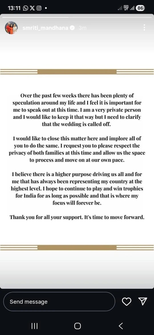 After a long period of silence, Smriti Mandhana issued an official statement confirming the cancellation of the wedding and appealing to everyone to respect their privacy Next Story