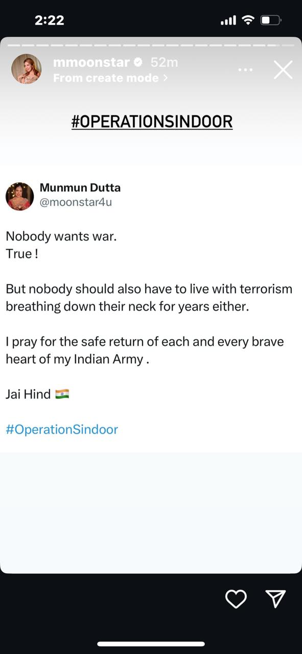 Actress and public figure Munmun Dutta, known for her versatile acting skills and strong on-screen presence, recently took to Instagram to share a powerful and emotional message in support of the Indian Army. With a career spanning over a decade in Indian television and media, Munmun has carved a space for herself not just as a performer but also as someone unafraid to speak her mind on social and national issues. Also Read: Ali Merchant and Andleeb Zaidi Host Glam Party to Celebrate Her Miss Universe Milestone In a recent Instagram story, she wrote: “Nobody wants war. True! But nobody should also have to live with terrorism breathing down their neck for years either. I pray for the safe return of each and every brave heart of my Indian Army. Jai Hind.”