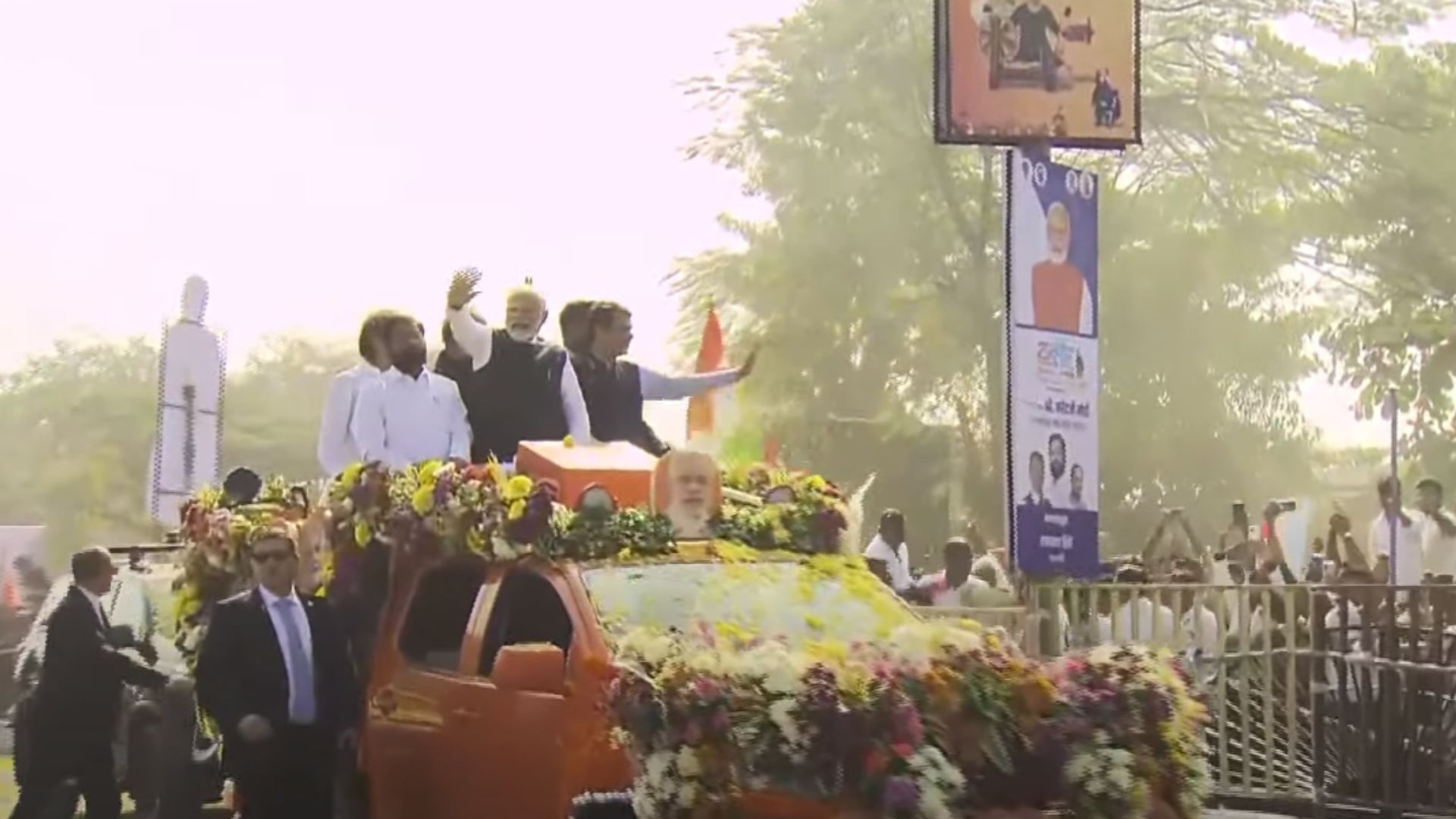 Prime Minister Narendra Modi led a vibrant roadshow in Nashik, Maharashtra, on Friday, where an exuberant crowd greeted him along the streets, enthusiastically waving and showering flowers on his motorcade. Accompanying him were Maharashtra Chief Minister Eknath Shinde and Deputy Chief Ministers Devendra Fadnavis and Ajit Pawar.
