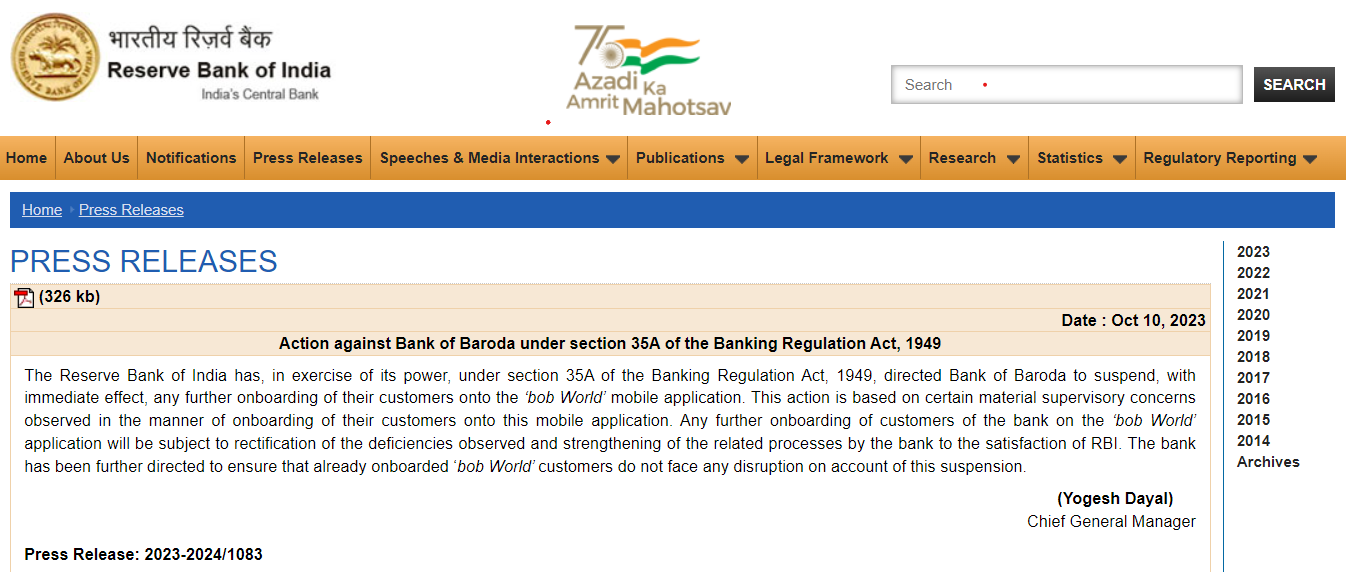 According to the RBI, any upcoming onboarding into "Bob World" will only be approved following the correction of any defects found and the strengthening of any relevant procedures. Bob was told to avoid causing any inconvenience to the current "Bob World" clients as a result of this ban.