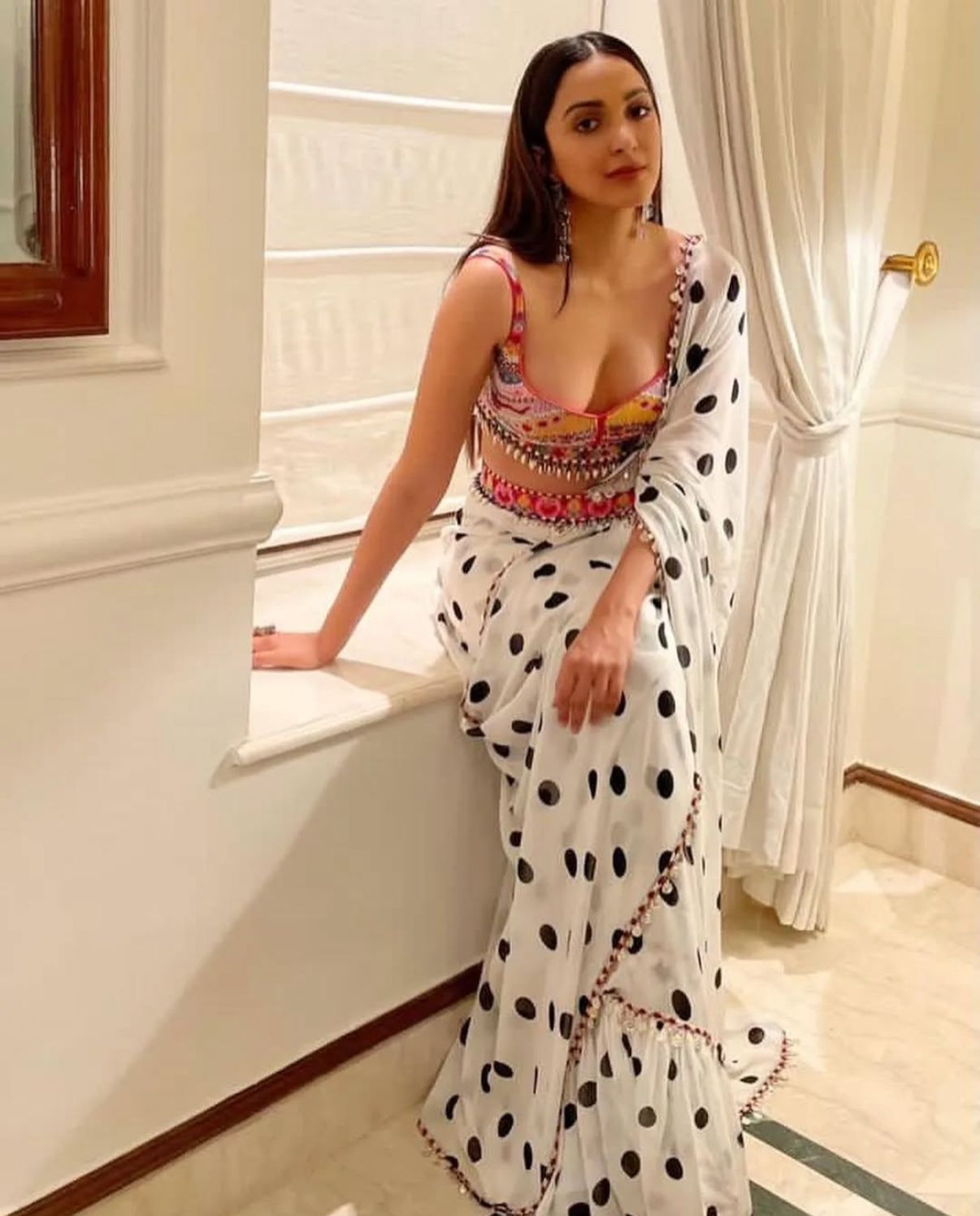 Kiara Advani brought a refreshing fusion twist to the polka-dot trend by donning a white polka-dot saree paired with a vibrant multicoloured blouse. The combination added a playful pop to her look while maintaining an elegant silhouette. Perfectly blending traditional draping with modern styling, Kiara’s ensemble stood out as a bold yet graceful take on the classic print.