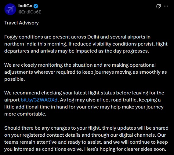 Due to dense fog, IndiGo airline issued a travel advisory on Wednesday. The airline warned that flights may be delayed at Delhi and several other airports in North India due to low visibility. Also Read: Delhi-NCR shrouded in toxic smog, GRAP-4 restrictions implemented, AQI crosses 350 in many places Next Story