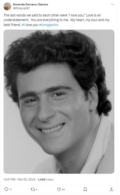 A subsequent tweet featured a photo of Tony Ganios with a caption that read," The last words we said to each other were, 'I love you.' Love is an understatement. You are everything to me. My heart, my soul and my best friend."