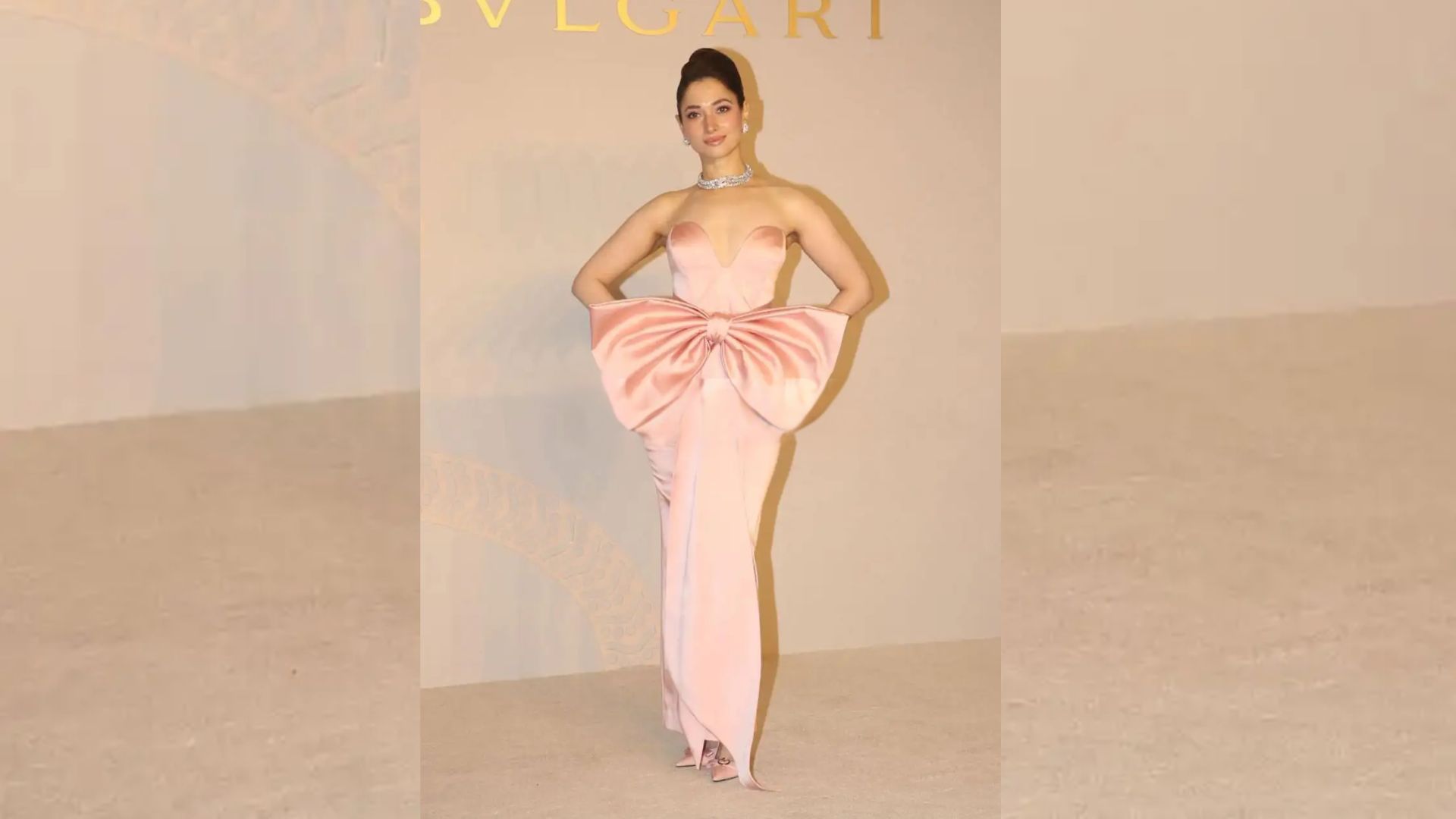 Tamannaah Bhatia redefined ‘fashion statement’ in a satin pink gown with a huge bow at her waistline. The form-fitted structure with a slightly flowy bottom enhanced the gown’s appeal, making her a standout. She styled her hair in a clean bun, accessorised her look with a heavy diamond neckpiece, studs and showed how to own the limelight!