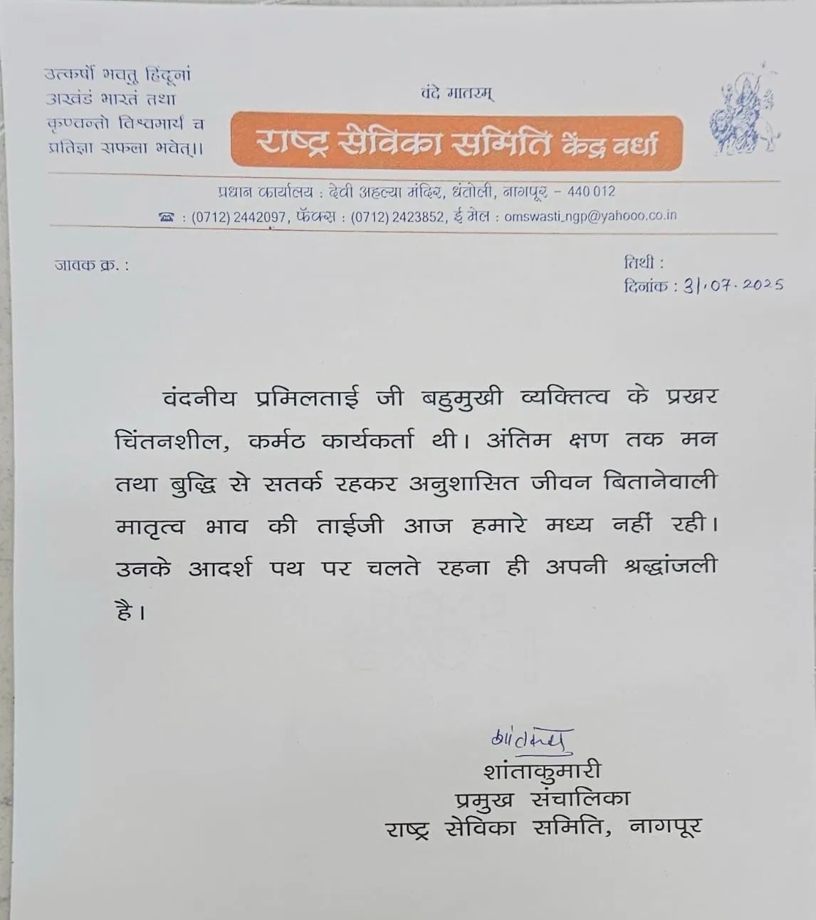 RSS wrote on behalf of Mohan Bhagwat on social media platform X, that with the death of Pramila Tai Medhe ji, the chief director of Rashtriya Sevika Samiti, a motherly umbrella has been removed from our head. With her death, her long penance from almost the time of the establishment of the committee till today has been completed.श्रद्धांजलि