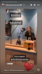 Actor Raveena Tandon on Thursday night shared a glimpse from the dubbing session of her upcoming film 'Ghudchadi'. Taking to Instagram, Raveena re-shared a video on her stories posted by the director of the film Binoy Gandhi and captioned it with a red heart emoticon.
